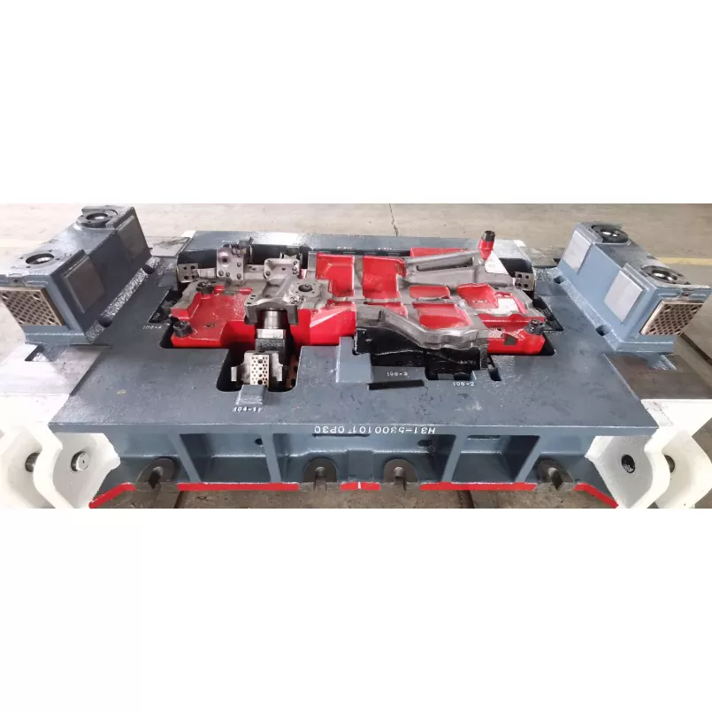 Automotive frontpanel montering stempling Dies bruker hyperboloid forming og en justerbar profil struktur. Kombinert med CAE-analyse og prosessoptimalisering, løser den problemer som rynker og sprekker, oppnår en overflatenøyaktighet innenfor ±0,05 mm, og sikrer kompatibilitet med tilstøtende komponenter.
